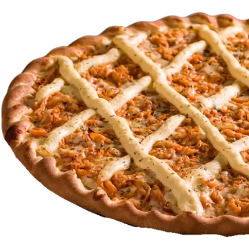 Pão de batata, molho de tomate, queijo mussarela, frango desfiado, bacon, milho e catupiry